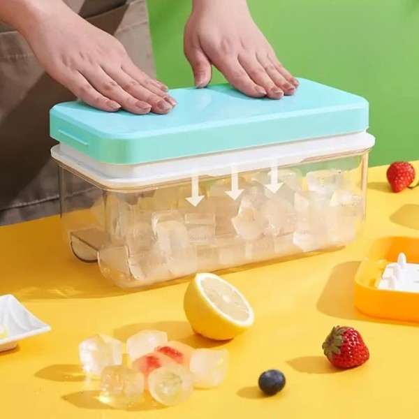 Odată ce gheața este gata, întoarceți tava, apăsați capacul și priviți cum cuburile de gheață cad în recipient. Fără bătăi de cap, fără mizerie.